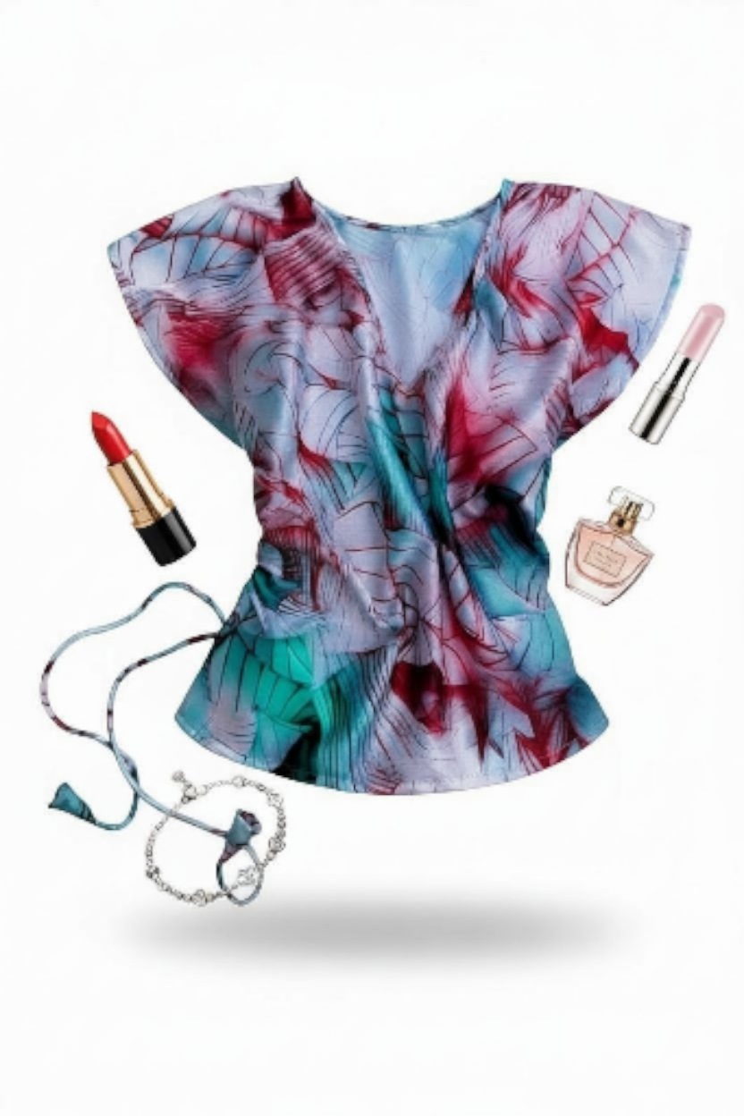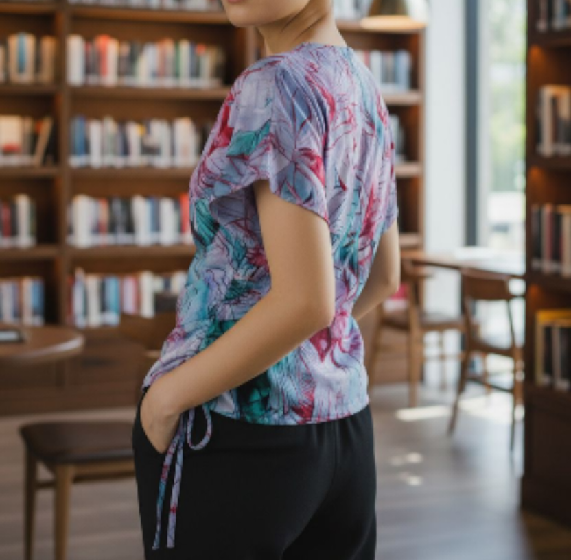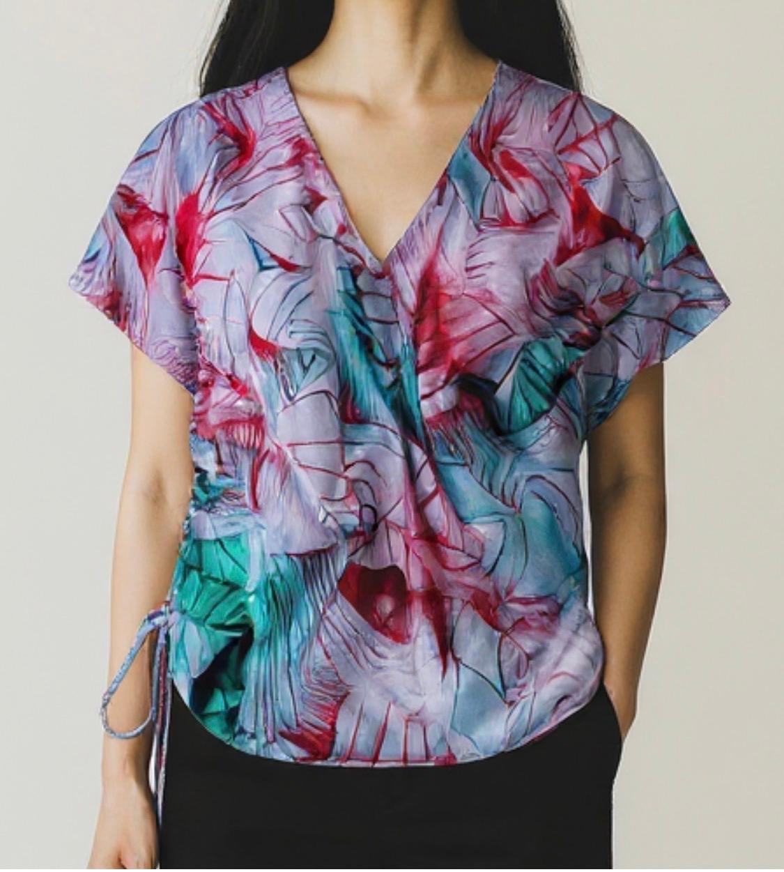 Flowy wrap top with flutter sleeves and adjustable side tie in soft aqua toned print which and glossy and soft.