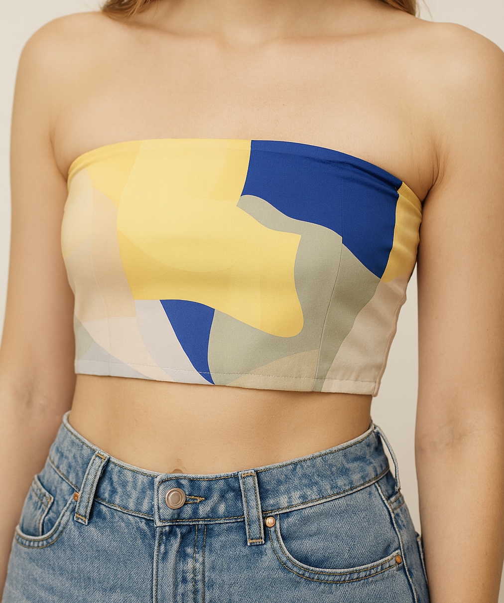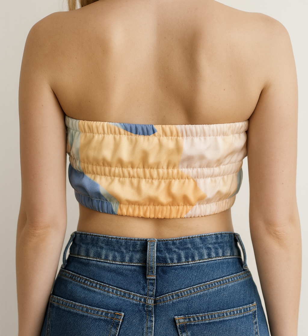 Printed satin fabric. Smooth-glossy textured abstract multicoloured print. 3-ways to wear- tube & shirt, shirt, only tube top.
