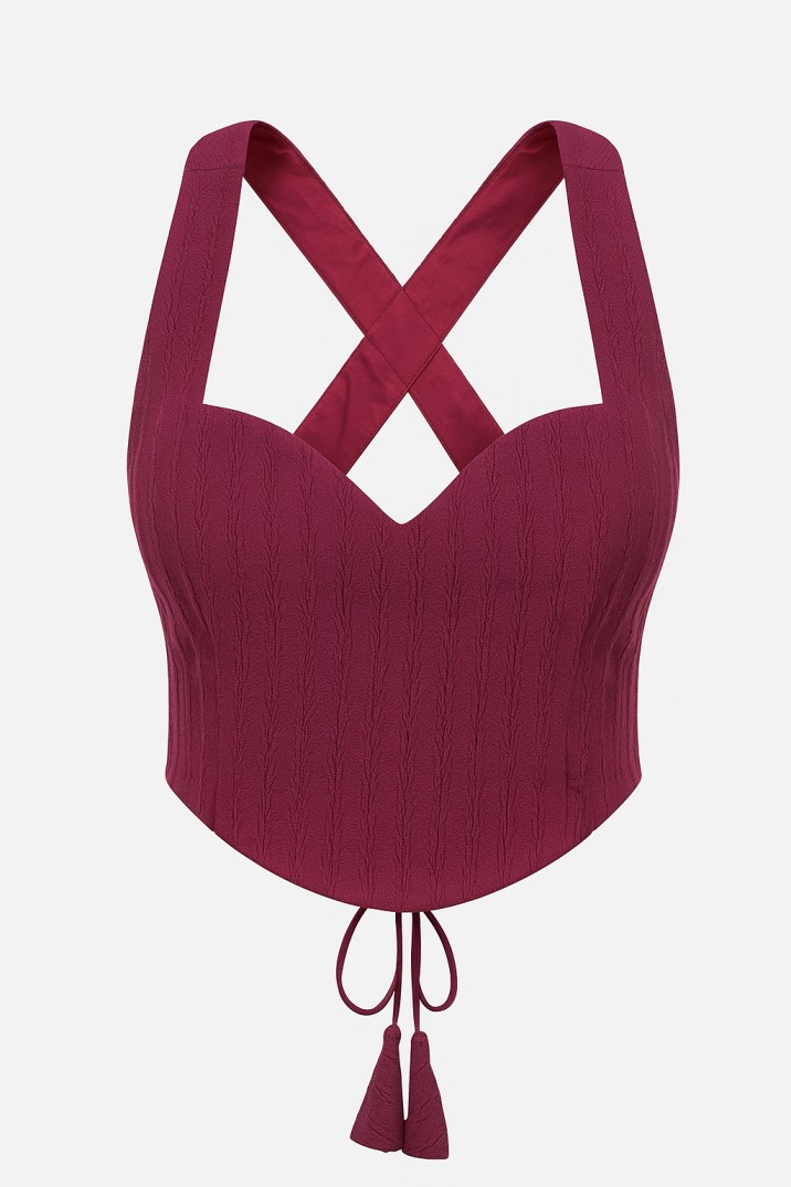 Ribbed knit fabric, vertical rib lines, soft, stretchy, hosiery. Maroon tone. Adjustable Strings on the back, sweetheart neck, and a corset look to the top.