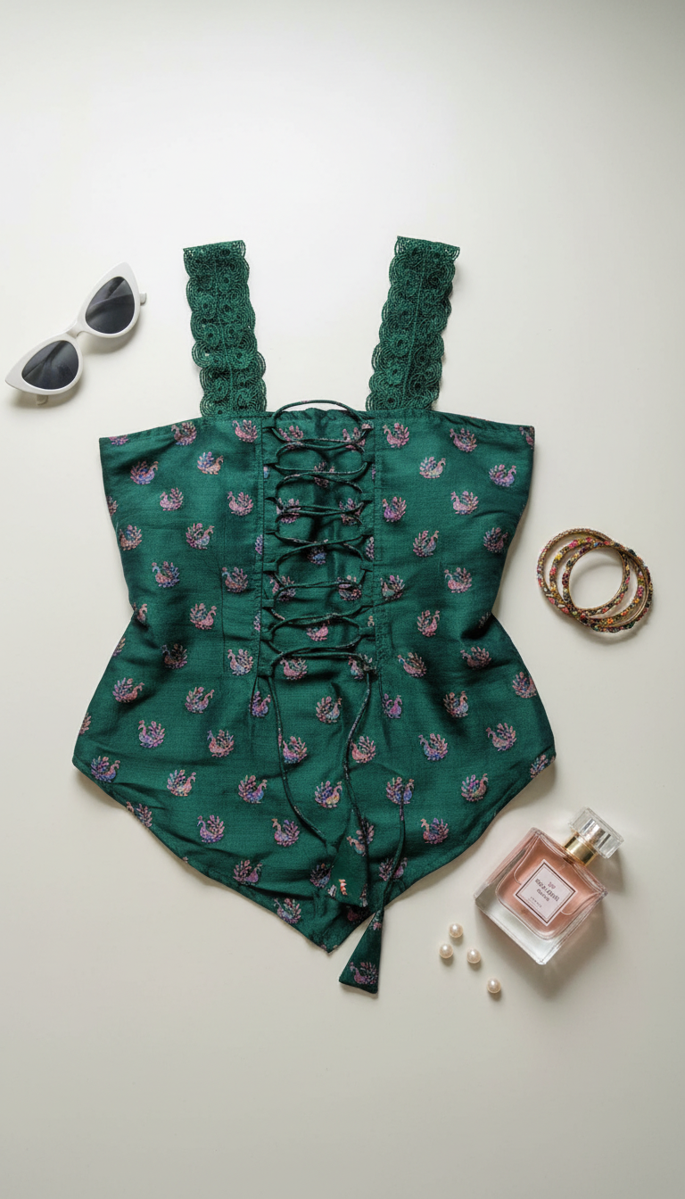 Polyester-silk fabric with peacock Buta print glossy finished in bottle green colour with crochet lace straps. Morden fusion look. adjustable fitting on back side.