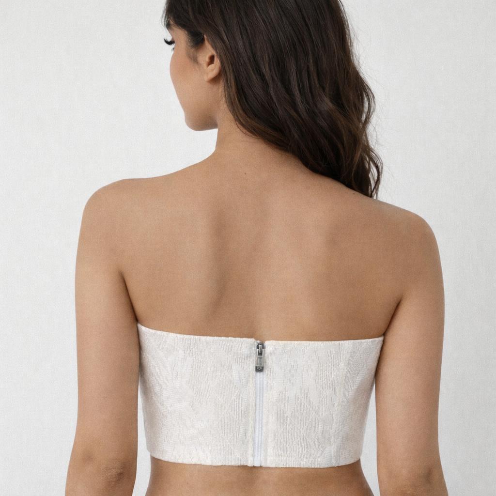 White Net Tube Top with Pearls on front side. Build-in pads. Back Zip Lock.